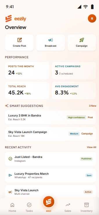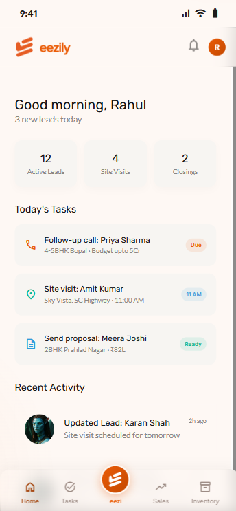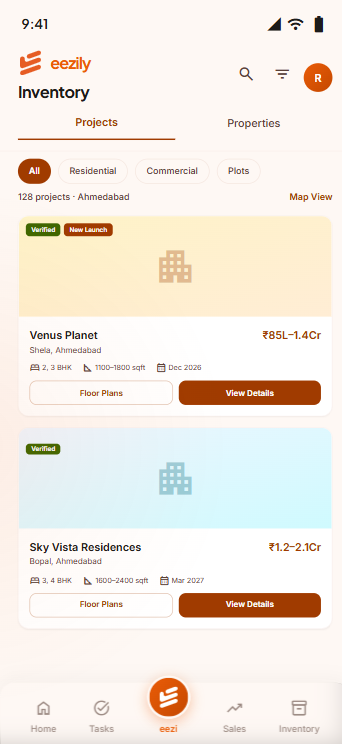 eezily is India's first voice-powered PropTech platform for real estate professionals. Say it. The system does the rest. CRM, inventory, marketing, training, community — everything, in one place.